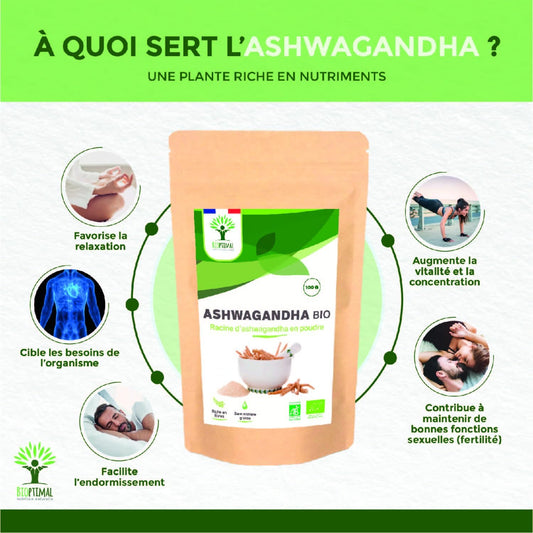 Bioptimal - Racines d'Ashwagandha Indien Bio en Poudre - Withania Somnifera 100% Pur - Sommeil Anti-Stress Libido Adaptogène - Contrôlé et Conditionné en France - Certifié Ecocert - 100g
