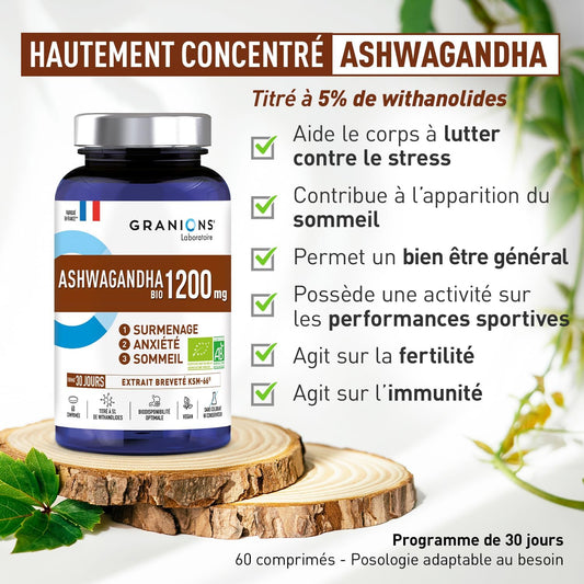 ASHWAGANDHA BIO 1200 MG GRANIONS 30 Jours - Ashwagandha KSM-66 + 5% Withanolides -Ashwagandha Bio Anti Stress Adulte, Sommeil Adulte, Immunité, Vegan - 60 comprimés - Fabriqué en France