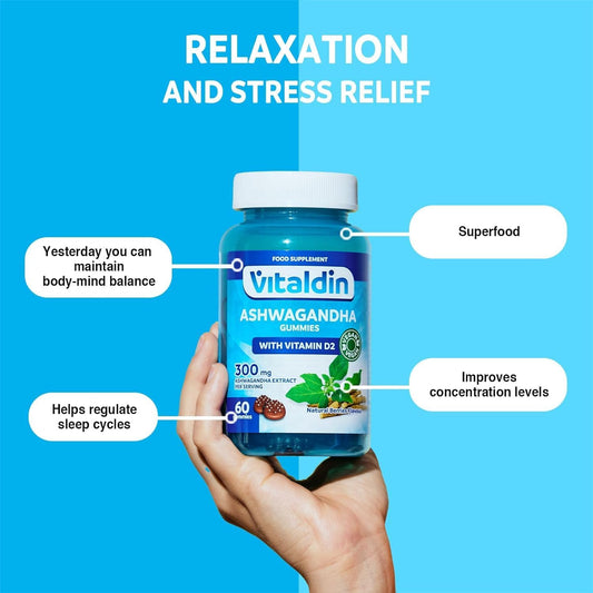 VITALDIN Ashwagandha Gummies – 300 mg d'extrait de Racine d'Ashwagandha KSM-66 & 1.000 UI Vitamine D2 – 60 gommes (pour 1 mois) Goût Fruits Rouges – Adaptogène Anti-stress; Calme et Relaxation – Vegan