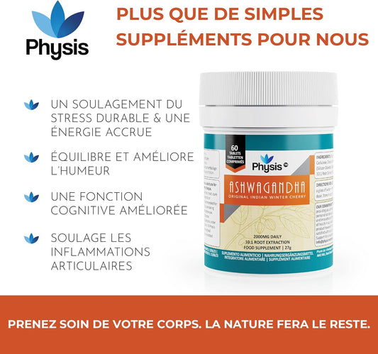 Comprimés Physis Ashwagandha | 60 comprimés | 2000mg haute résistance | Supplément d'extrait de racine Ashwagandha Pure KSM 66 | Soutient le corps et la cognition | Végétalien